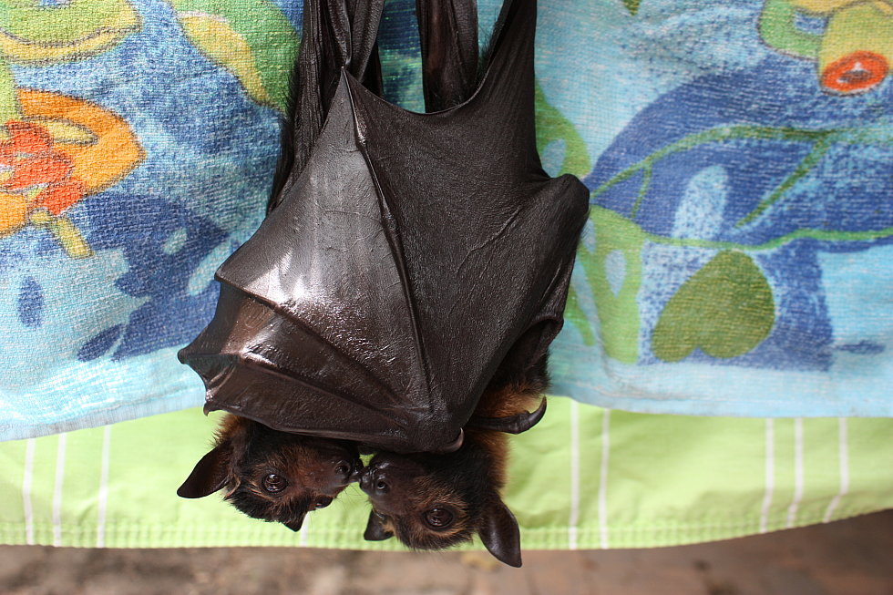 Bats and Flying Foxes are similar to humans in that they are placental mammals. This means that they do not have pouches like marsupials and give birth to well developed young (pups). The young hang on to their mother with their mouth wings and feet while Mum supports them with her wing.